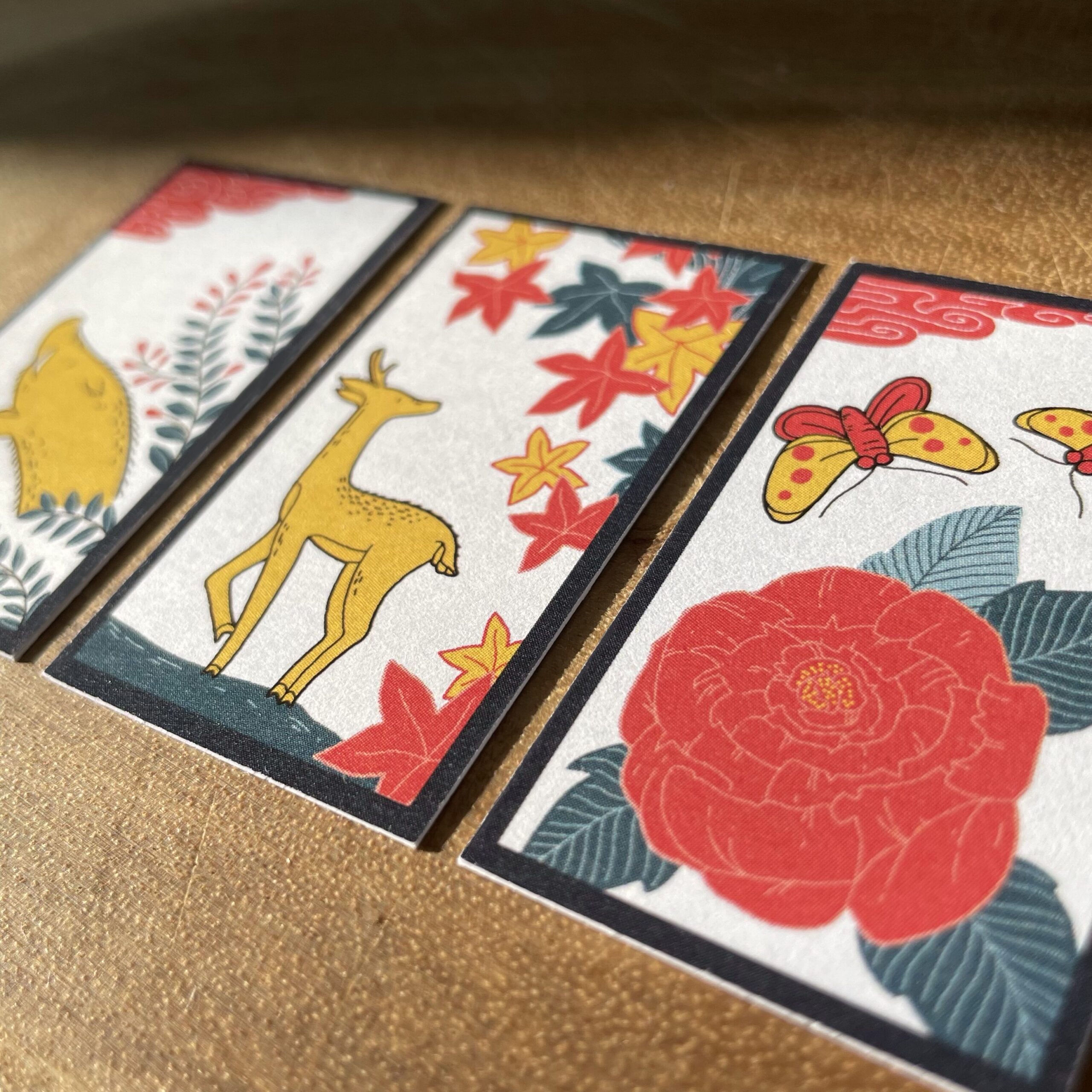 Vaddisznó – szarvas – pillangó nevű yaku. Mit gondoltok, mit takarhat? A tane lapok közül a legszebb 3-at. 🙂 Ebben az esetben is érvényes a +1 pontos szabály, ugyanúgy, mint a tanok esetében. Mivel ez a legnagyobb értékű formáció a tane-k között, ehhez adódik a +1 pont minden további tane után.